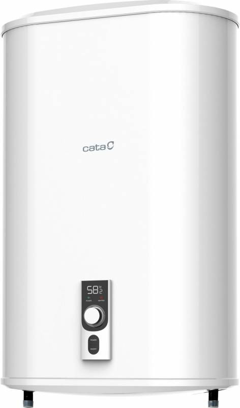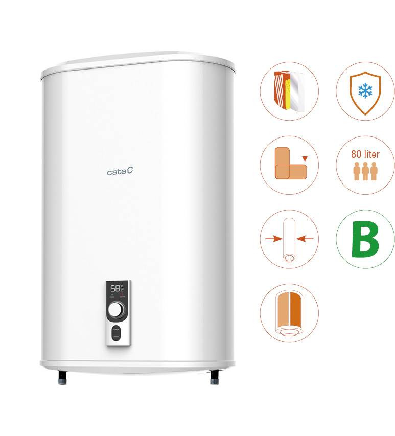 Cata CTRS-80 REV SLIM 80 literes elektromos vízmelegítő, teljesítmény: 1200/2000 W, vízszintes vagy függőleges szerelés, dupla tartály, 850º C-ig hőálló titán zománcozású acéltartály, digitális kijelző, elektronikusan állítható hőmérséklet (1ºC-os pontosággal) teljesítmény szabályzás (mono/duo/automata), magnézium anód, szuper-szigetelés CFC- és HCFC-mentes poliuretánnal, fagyás elleni védelem, hibakijelzés, biztonsági szelep, speciális külső poliészter festés