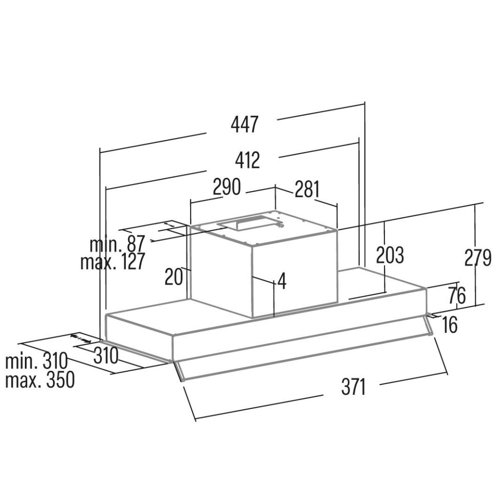 A készülék 3 + 1 (turbó) teljesítményfokozattal rendelkezik, amelyeket egyszerűen szabályozhatunk az üveg légterelő mögött található nyomógombos vezérlésen keresztül. A maximális légszállítási kapacitás 1150 m³/h, így hatékonyan távolítja el a főzés során keletkező párát, gőzt és szagokat. A működés közbeni zajszint 56 és 70 dB(A) között mozog, ami a kategóriájában átlagosnak tekinthető.