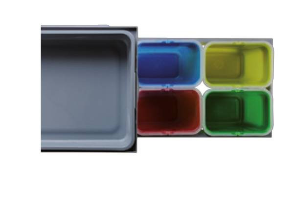 szelektív hulladékgyűjtési lehetőség, rugalmasan összeállítható kombinációk, optimalizált helykihasználás, teljesen kihúzható rendszer, 30 kg-ig terhelhető horganyzott acél sínek, könnyen kivehető akár mosogatógépben is mosható szemetes vödrök és fedelek, stabilitás a szemetes vödröket tartó keretmegoldásnak köszönhetően, vasból készült festett első tartó keret, többcélú tálca, egyszerű és gyors telepítés