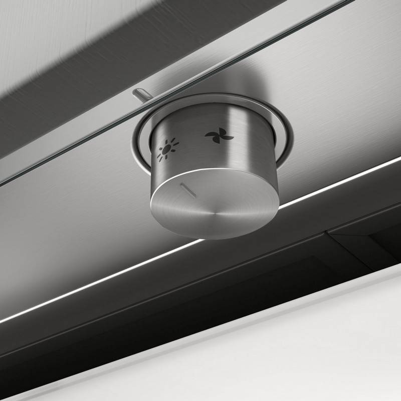 A készülék forgókapcsolós vezérléssel rendelkezik, amely egyszerű és megbízható működtetést biztosít. A kapcsoló, amely az üveg légterelő lap mögött található, lehetővé teszi a három elszívási fokozat közötti könnyed váltást, valamint a világítás be- és kikapcsolását. A forgókapcsoló nemcsak praktikus, hanem innovatív is: egy egyszerű gombnyomással elrejthető a páraleszívóba, és ha újra szükség van rá, egy újabb gombnyomással könnyedén előcsalogatható, így mindig kéznél van, amikor szükség van rá.