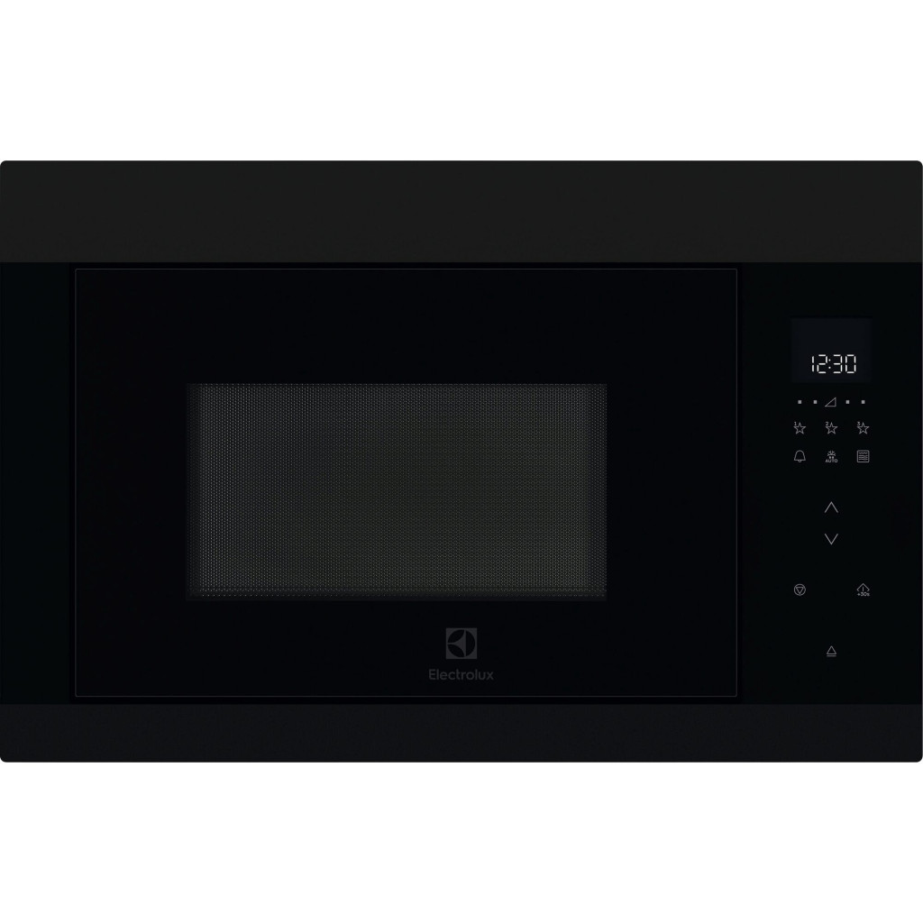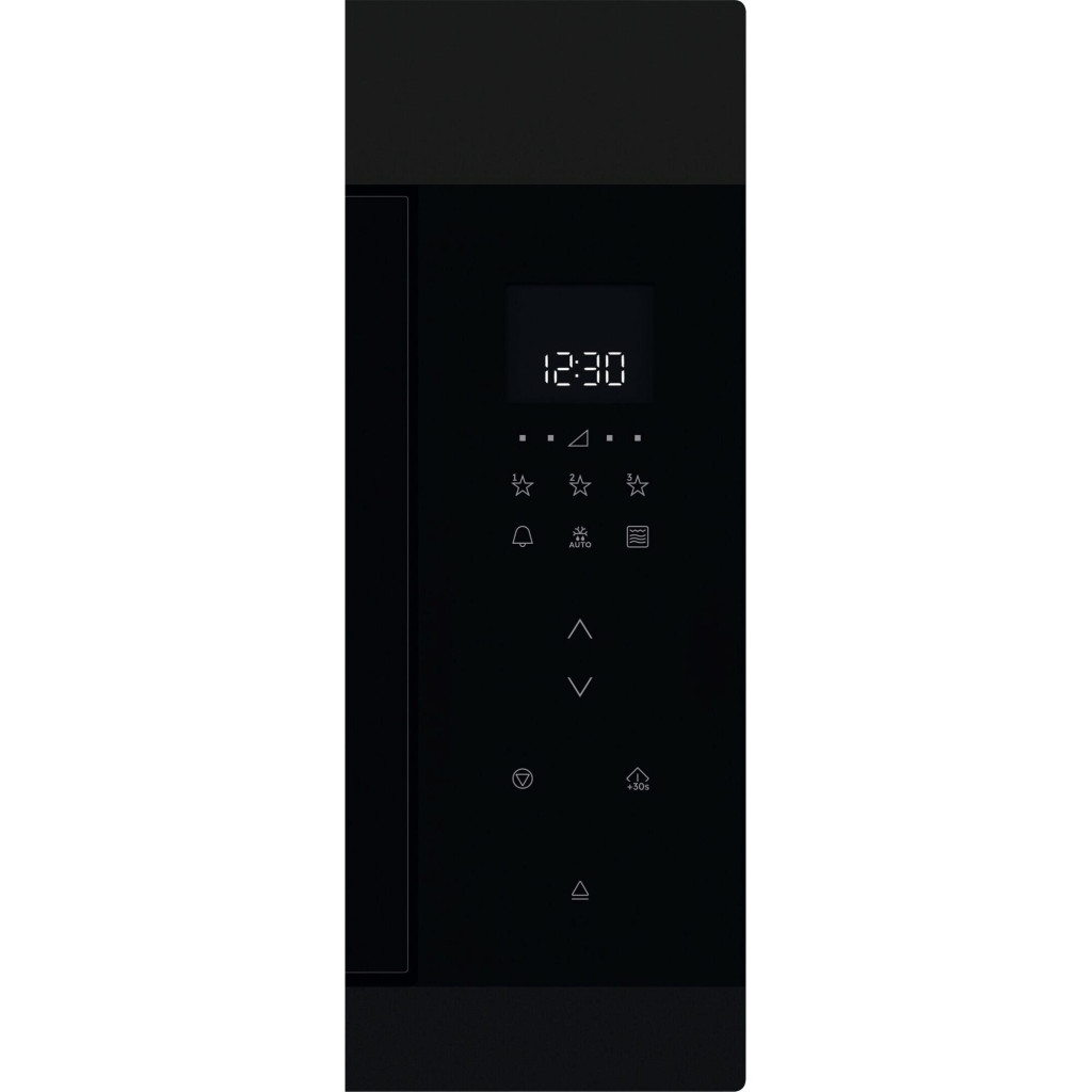 A mikrohullámú sütő prémium ajtófelülete elegáns matt és fényes fekete részletivel harmonikusan illeszkedik a többi készülékhez és a teljes konyhai környezethez.