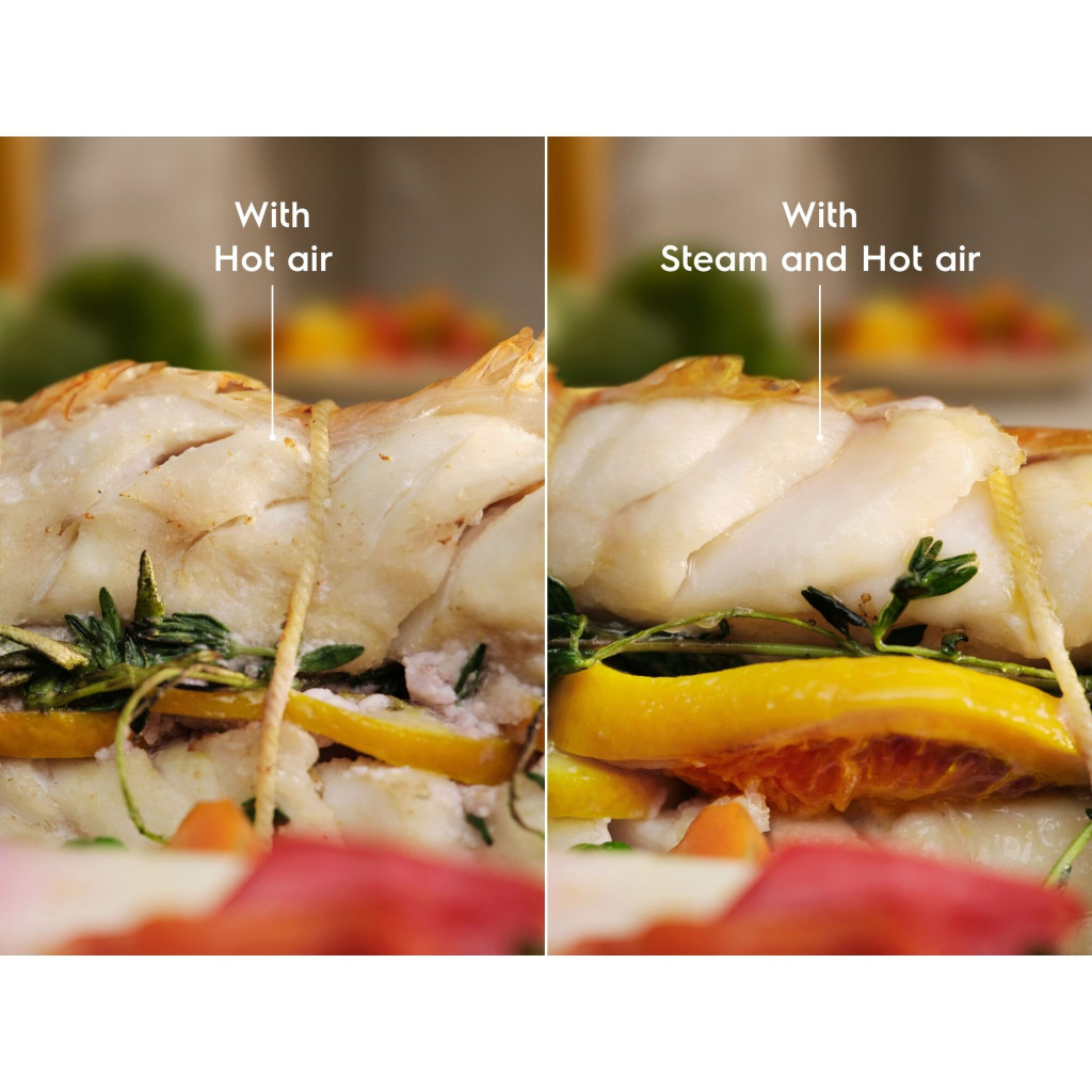A SteamCrisp® multifunkciós sütő a hőt és a gőzt kombinálja a sütéshez és grillezéshez. Ennek köszönhetően az ételek kívül ropogósak, belül pedig szaftosabbak lesznek – a húsok még szaftosabbak, a halak pedig akár 20%-kal* omlósabbak lesznek, mint egy hagyományos sütőben.