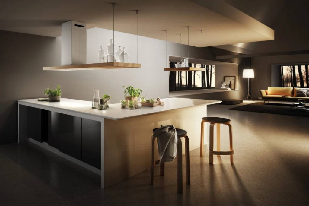 A páraelszívó bútorrá válik, egy intelligens funkciókkal rendelkező polccá. A világítás fehér tónusát a konyha többi lámpájához igazíthatja, míg az USB aljzat lehetővé teszi a tabletek és okostelefonok csatlakoztatását és töltését. Az új generációs motor biztosítja a szükséges teljesítményt az alacsony zajszint és fogyasztás fenntartása mellett; egy speciális érzékelő automatikusan szabályozza a beszívandó pára mennyiségét. Intelligens megoldás, amely integrálja az elszívást, a csendet és a hatékonyságot.