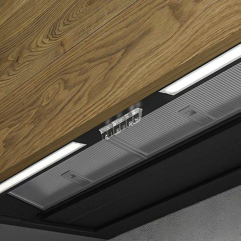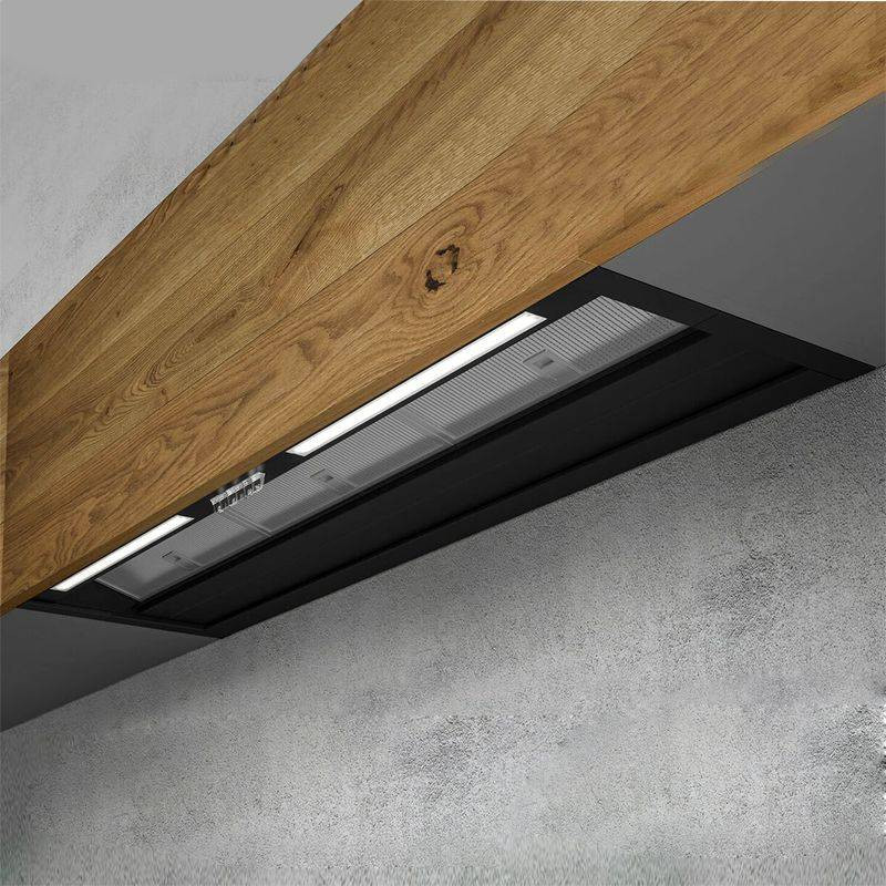 Figyelemre méltó esztétikai hatású páraelszívó, amelyet a kivételes beépítési sokoldalúság jellemez, amely lehetővé teszi a mélység milliméteres beállítását.