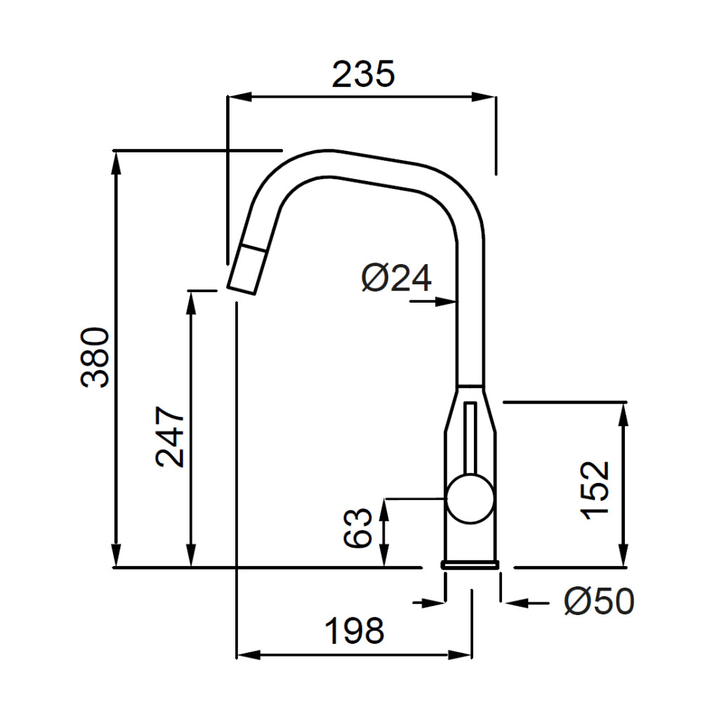 Magas ívelt, kerámiabetétes csaptelep, oldalsó szabályzóval, forgatható kifolyócsővel, kihúzható fejjel, normál beépítéssel, Ø35 mm-es furattal.