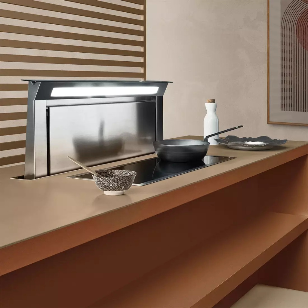A Falmec DOWN DRAFT 90 különlegessége a motoros mozgatórendszerben rejlik: működés közben hátrafelé emelkedik ki a munkalapból, majd a főzőedények közelében szívja el a gőzt. Ez az innovatív megoldás nemcsak a hatékony elszívást garantálja, hanem a szekrényen belüli hely optimális kihasználását is lehetővé teszi. A 150 mm-es csőcsatlakozás biztosítja a megfelelő légáramlást, amely a különböző motorvariációkhoz és beépítési típusokhoz rugalmasan illeszthető.
