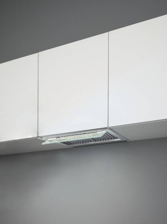 Új érintővezérlés a kihajtható üveg légterelőn, így az ajtó kinyitása nélkül is elérhetők a páraelszívó funkciói.