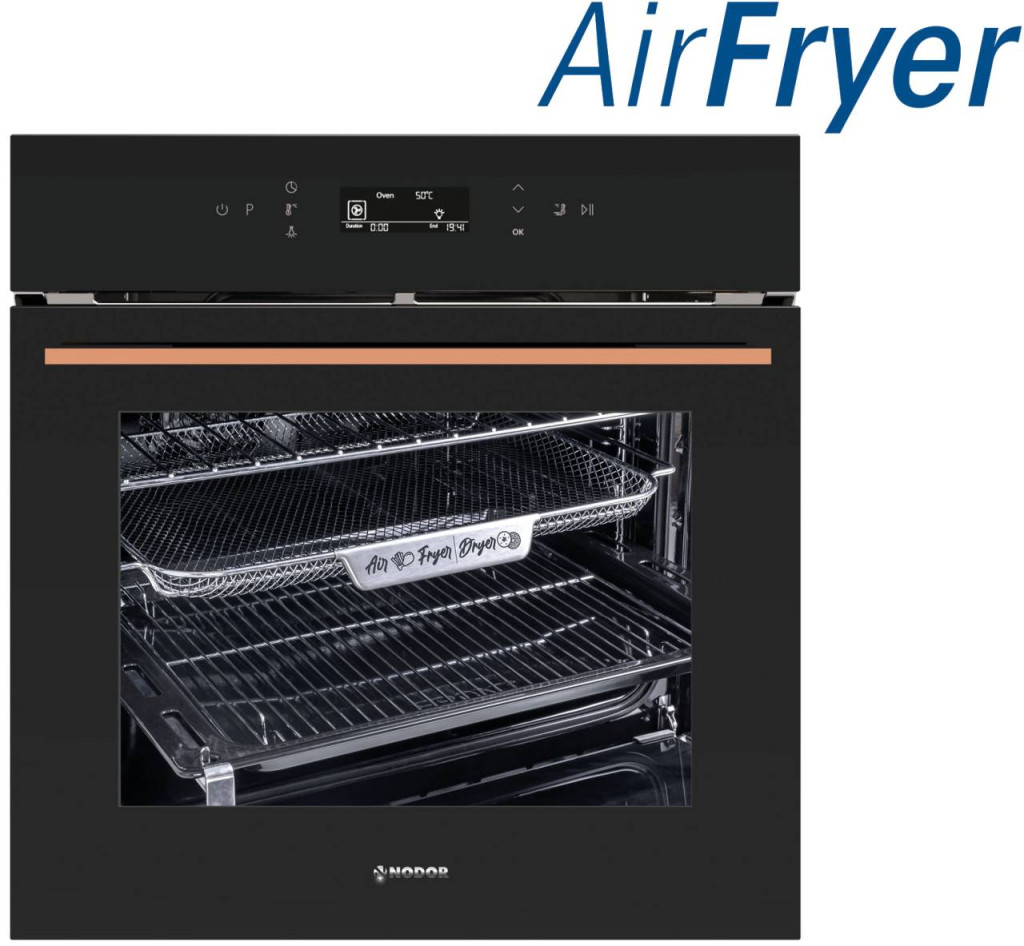 NODOR MO-6800 CU fekete AIR FRYER beépíthető sütő esztétikus réz fogantyúval, 10 sütőfunkcióval, AIR FRYER sütési mód, érintővezérlés,állítható hőfok 50-250 ºC, 5 szint a tálcák elhelyezéséhez, 1 db 100%-ban kihúzható sütősín, 1 db tepsi, 1 db grillrács, tripla üvegezésű sütőajtó, Fast preheat, Nsoft, Nchild, Nhome-Baked, Nclean, Softclose door, 67 literes, fehér üveg előlap, réz fogantyú.