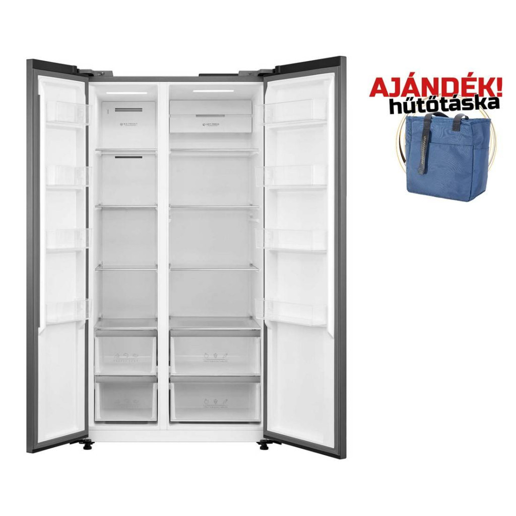 kétajtós side by side szabadonálló kombinált hütőszekrény NO-FROST technológiával, LED világítás, 180 cm magas, 592 literes, 379 literes normál hűtőrész, 213 literes fagyasztó, elektronikus hőmérséklet szabályozás kijelzéssel, 3 db biztonsági üvegpolc, 4 db polc az ajtókon, 2 db zöldségtartó fiók páratartalom szabályzással, 2 db fagyasztó fiók, fogyasztás: 330 kWh/év, zajszint: 41 dB(A), áramkimaradás esetén 12 óra leolvadási idő