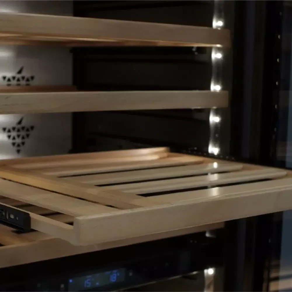 A SIRIUS SW-1 borhűtő akár 105 palack tárolására is alkalmas, így méltó helyet biztosít a borok iránti szenvedélynek és a gondosan összeválogatott gyűjteménynek. A 15 prémium bükkfa polc nemcsak elegáns, hanem a palackok stabil tárolását is garantálja. A polcok teleszkópos síneken mozognak, így könnyedén kihúzhatók, ami maximális kényelmet biztosít: a palackokhoz mindig egyszerűen és biztonságosan férhet hozzá, anélkül, hogy megbolygatná a többi bort. Ez a megoldás különösen praktikus, ha nagyobb gyűjteményről van szó, hiszen a tárolás mellett a használat is élménnyé válik.