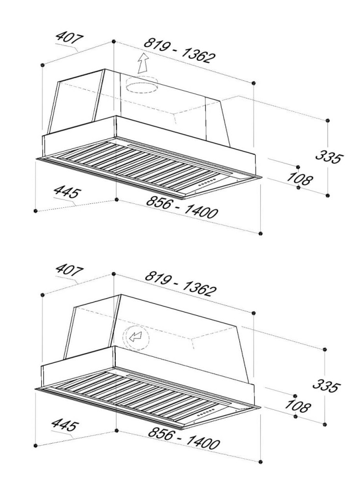 A páraelszívó csőcsatlakozása és hátsó kivezetése egyaránt 150 mm átmérőjű, amely biztosítja a hatékony légáramlást és egyszerű csatlakoztathatóságot a konyhai szellőzőrendszerhez. Ez a méret szabványos, így könnyen illeszthető a legtöbb háztartási elszívó rendszerhez.