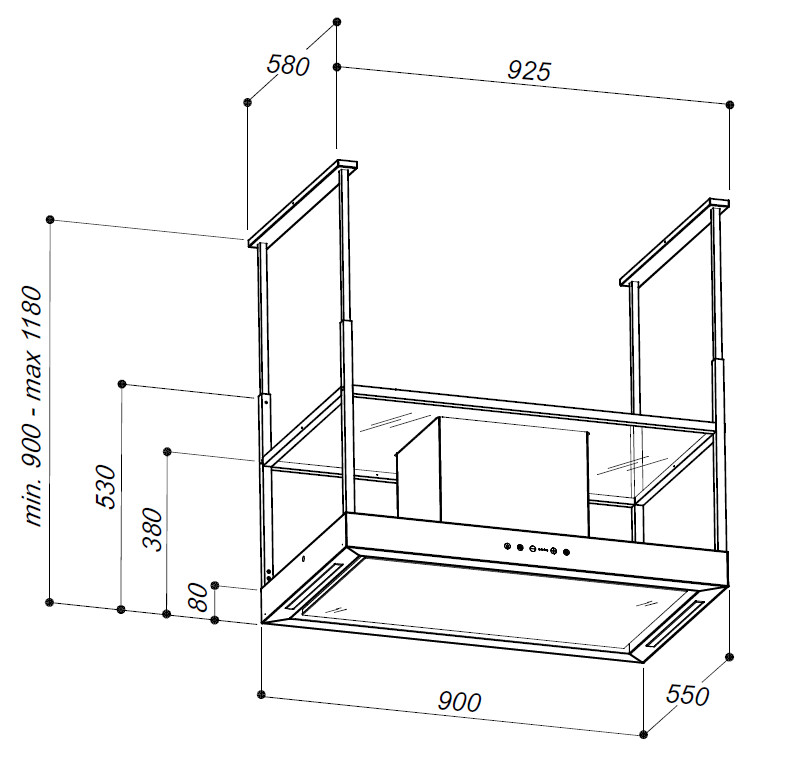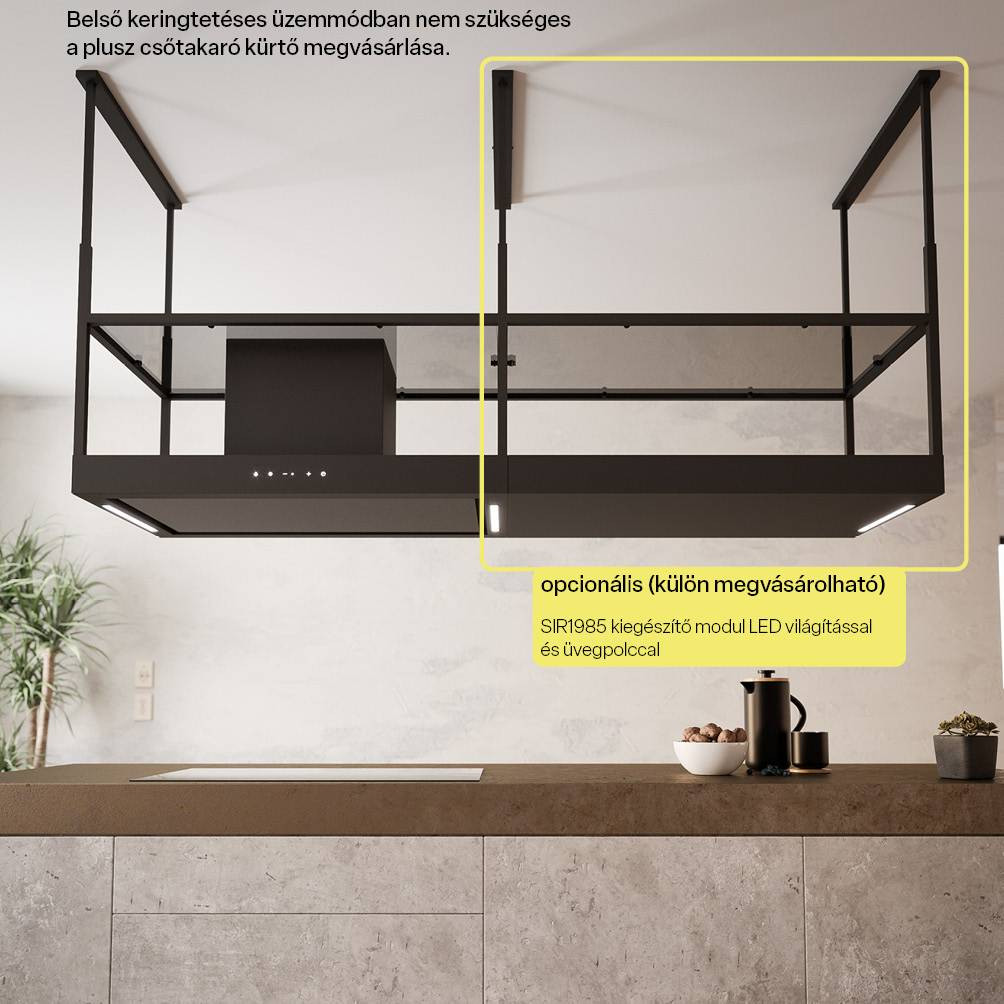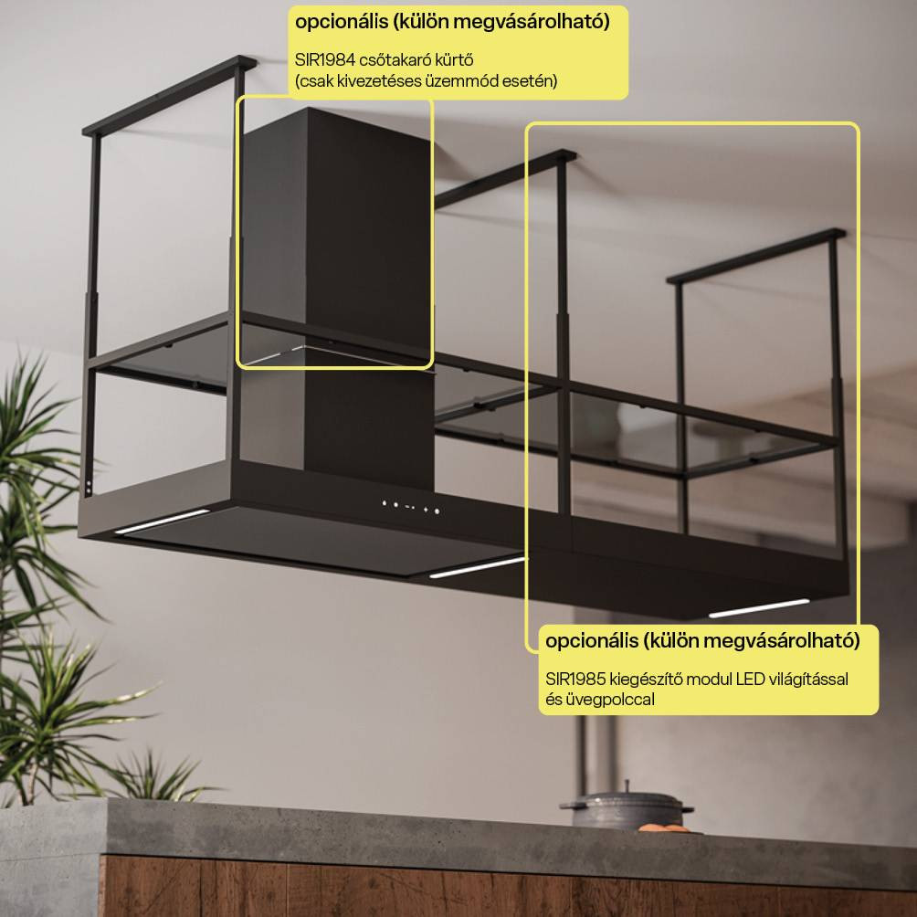 A páraelszívó tovább bővíthető extra polc modullal, amely praktikus tárolófelületet biztosít a főzéshez szükséges kisebb eszközök vagy fűszerek számára. Ez a megoldás növeli a készülék használati értékét, miközben megőrzi annak elegáns megjelenését. A Sirius itt is a funkcionalitás és az esztétikum közötti egyensúlyt tartotta szem előtt.