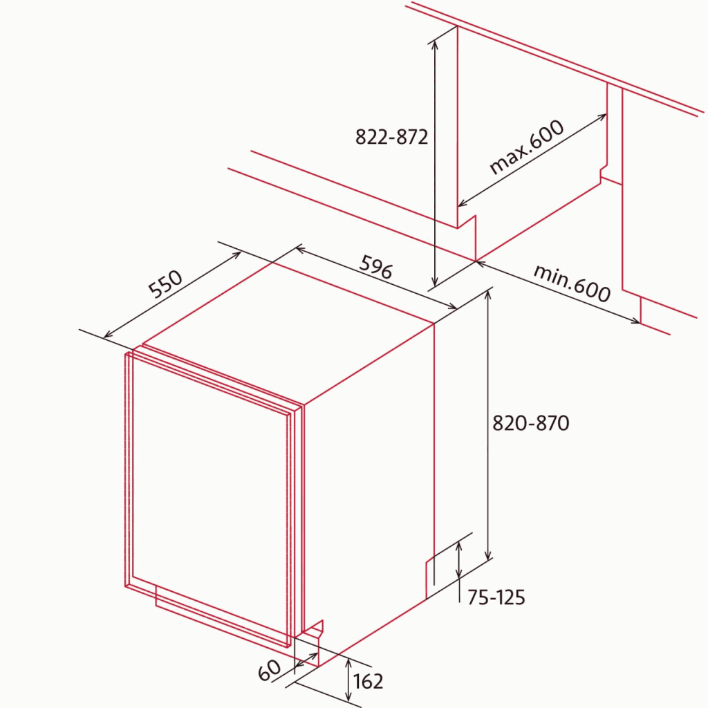 pult alá építhető hűtőszekrény belső fagyasztóval, LED világítás, 111 literes, 95 literes normál hűtőrész, 16 literes fagyasztó, elektronikus hőmérséklet szabályozás, 1 db biztonsági üvegpolc, 2 db polc az ajtón, 1 db zöldségtartó fiók, belső fagyasztórész nyitható ajtóval, nyitott ajtó riasztás, fogyasztás: 147 kWh/év, fagyasztó kapacitás: 2,6 Kg/24 óra, zajszint: 40 dB(A), megfordítható ajtónyitás